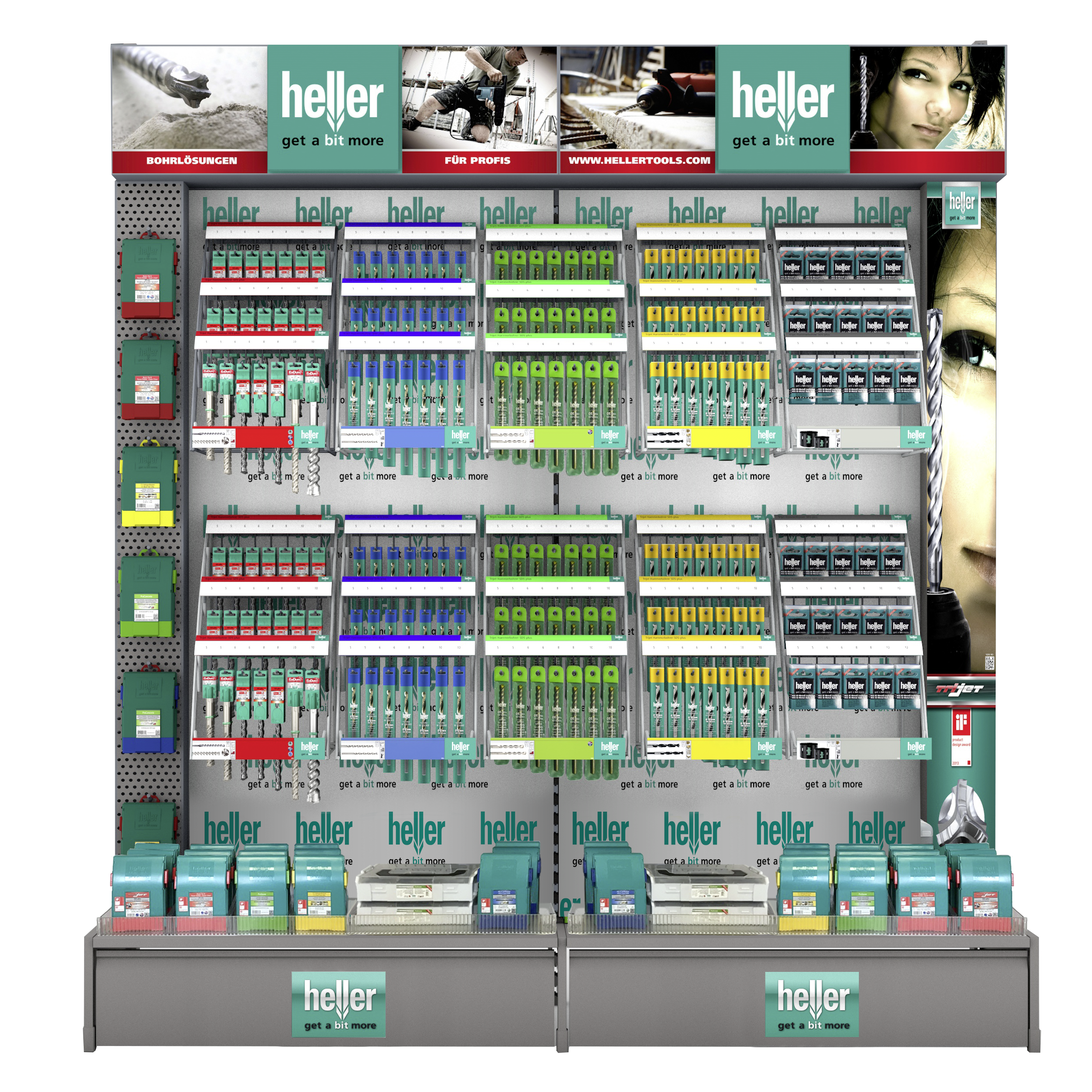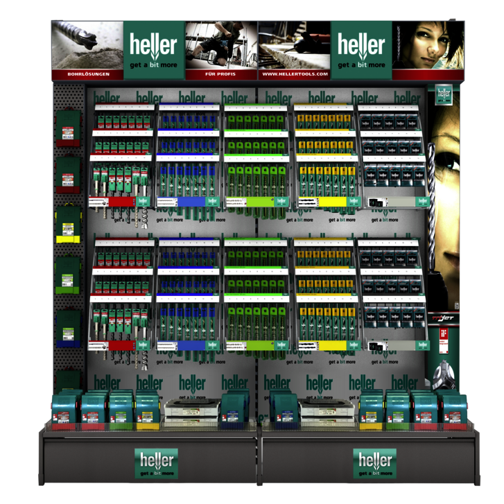 The new, attractive presentation of Heller products guarantees a perfect overview of the Heller product assortment. The tried and tested colour coding system and the clear description of the products enable the buyer to find his way around easily and lead him quickly to the right product selection. The presentation of drill bits etc. on the shelf is supplemented by attention-grabbing secondary placements. In addition, Heller also carries out regular promotions in which retailers and end customers benefit from special advantages.