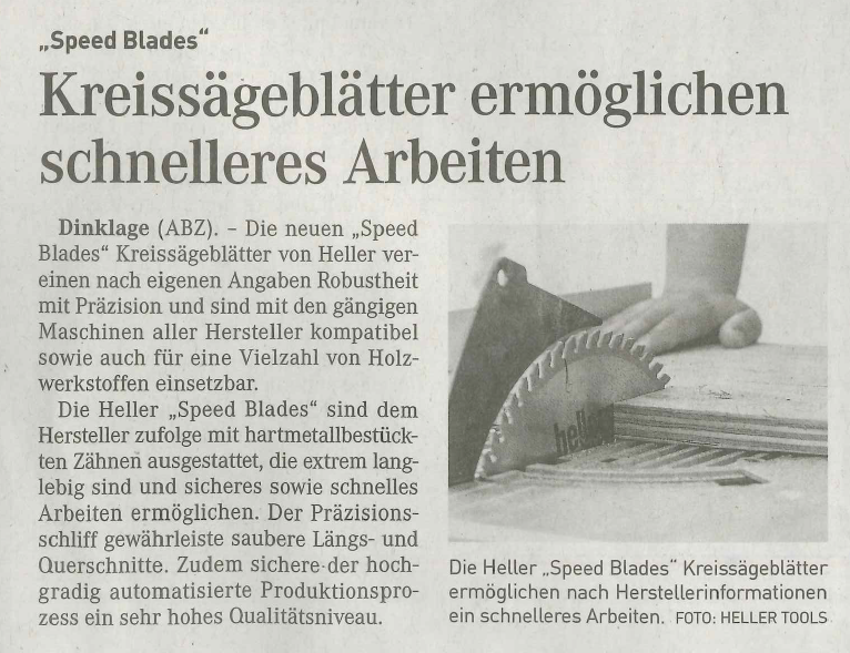 Die Fachzeitschrift "Allgemeine Bauzeitung" berichtet in ihrer aktuellen Ausgabe über die neuen Heller Speed Blades. Hier geht's zum Artikel.