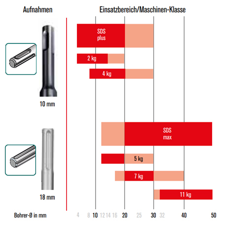 Das Schnellspannsystem SDS ist der heute etablierte Standardanschluss von Hammerbohrern. Es garantiert beste Kraftübertragung des Bohrsystems bei schneller, einfacher und sicherer Einspannung des Bohrers in den Bohrhammer. Je nach Aufgabe gibt es das am weitesten verbreitete Format, SDS-plus, mit einem Durchmesser von ca. 10 mm für Bohrhämmer < 5kg sowie SDS-max für Bohrhämmer > 5 kg mit einem Durchmesser von ca. 18 mm.